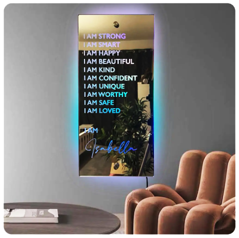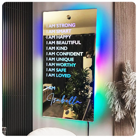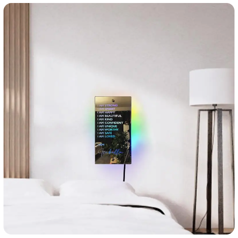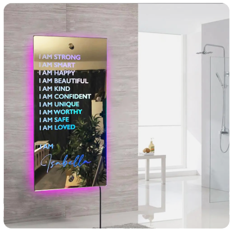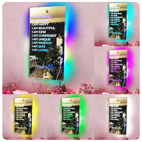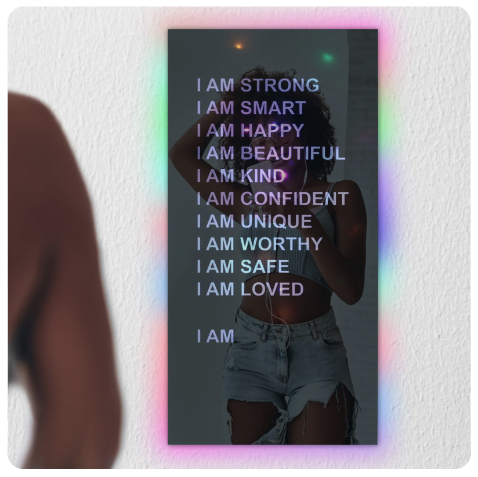 Transform any space with the stunning visual appeal of our multi-colored customizable LED Affirmations Mirror. This unique & modern addition not only serves as a mirror but also as a vibrant piece of art that enhances your room’s aesthetic.